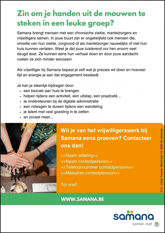 Deze flyer kan je gebruiken om nieuwe vrijwilligers te zoeken. Je laat de flyer aanpassen met de correcte informatie van jouw basiswerking (naam verantwoordelijke, adres, telefoonnummer…). Je kan de flyer dan zelf laten afdrukken of wij kunnen deze ook voor jou laten afdrukken (tegen betaling). De flyer kan je dan in brievenbussen steken of uit delen op beurzen en dergelijke. Om deze flyer op te maken kan je bij je educatief medewerker terecht.